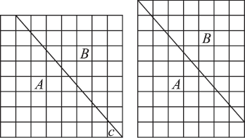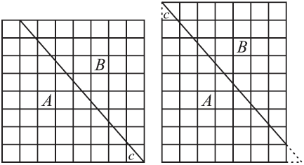 На клетчатой бумаге обчерчиваю квадрат, заключающий в себе 64 маленьких квадратика. Затем провожу косую линию слева направо, начиная с той точки, где вверху сходятся первый и второй квадратики, и кончая правым нижним углом большого квадрата. Противоположный конец этой косой линии разрежет пополам последний квадратик справа, и в нем образуются два треугольничка. Нижний треугольничек обозначим буквой С. Всю левую часть чертежа обозначим буквой А, а правую – буквой В. Теперь разрезаю чертеж по косой линии и двигаю правую часть косо вверх по разрезу так, чтобы эта часть поднялась на один ряд квадратиков. Вверху окажется при этом маленький пустой треугольничек, а внизу направо будет выдаваться треугольничек С. Беру ножницы, отрезаю выступающий маленький треугольничек С и помещаю его вверху – там, где остался незанятый треугольник.