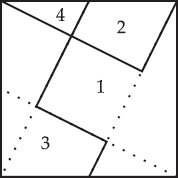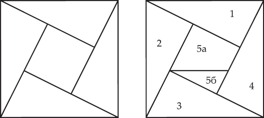Если вы догадались, как решить эту задачу, попробуйте составить квадрат из пяти одинаковых треугольников такой же формы, как те, с которыми мы сейчас имели дело (один катет вдвое длиннее другого). Вы можете разрезать один треугольник на две части, но остальные 4 должны итти в дело нерезанными.