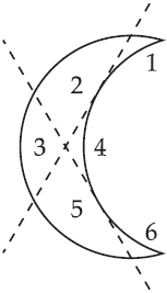 ЗАДАЧА № 55 Лунный серпЭту фигуру лунного серпа требуется разделить на 6 частей, проведя всего только 2 прямых линии.