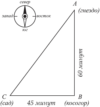 Геометрия учит, что если какая-нибудь величина содержится в одном катете 3 раза, а в другом – 4 раза, то в третьей стороне – гипотенузе – та же величина должна содержаться ровно пять раз. Например, если катеты треугольника равны 3 и 4 метрам, то гипотенуза = 5 м; если катеты 9 и 12 километров, то третья сторона = 15 км и т. п. В нашем случае один катет 3x15 мин. пути, другой – 4x15 мин. пути; значит, гипотенуза АС = 5x15 минут пути. Итак, мы узнали, что из сада к гнезду шмель летел 75 минут, т. е. 1 1/4 часа.
