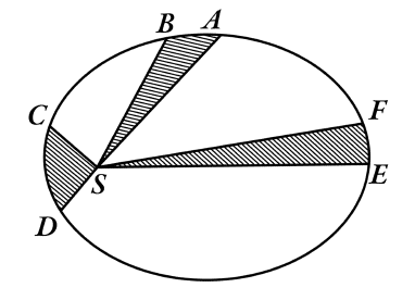 Рис. 20. Иллюстрация второго закона Кеплера: если дуги АВ, CD и EFпройдены планетой в одинаковые промежутки времени, то заштрихованные площади равны.