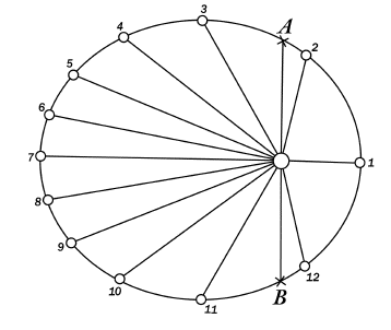Рис. 21. Как двигалась бы вокруг Солнца Земля по сильно вытянутому эллипсу (расстояния между соседними точками, отмеченными цифрами, проходятся планетой за равные промежутки времени – за месяц).