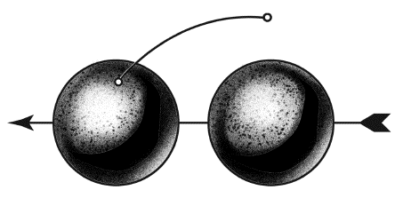 Первое перемещение равно 0,5 км. Второе – за 10 секунд времени падения тела – равно по широте Москвы 0,3x10 = 3 км. Третье движение – самое быстрое – 30 км в одну секунду. За 10 с, пока длится падение, тело переместится по земной орбите на 300 км. По сравнению со столь значительным перемещением оба предыдущих движения – ½ км вниз и 3 км в сторону – будут едва заметны; наблюдая с Солнца, мы обратим внимание лишь на самое значительное перемещение. Что же мы увидим? Примерно то, что показано (без соблюдения масштаба) на рис. 27. Земля переместится налево, а падающее тело – из точки на Земле в правом положении в соответствующую точку (только чуть пониже) на Земле в левом положении. На рисунке, мы сказали, масштаб не соблюден: центр Земли за 10 сек. передвинется не на 14 000 км, как изобразил для наглядности художник, а только на 300 км.
