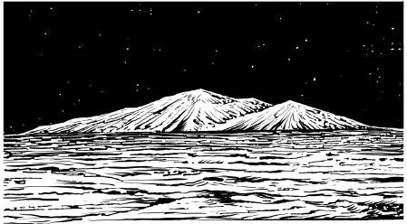 Отсутствие атмосферы на Луне и связанная с этим резкость теней создают при наблюдении в трубу любопытную иллюзию: малейшие неровности почвы усиливаются и представляются весьма рельефными. Положите половину горошины выпуклостью вверх. Велика ли она? А посмотрите, какую длинную тень она отбрасывает (рис. 44). При боковом освещении на Луне тень бывает в 20 раз больше высоты того тела, которое ее отбрасывает, и это сослужило астрономам хорошую службу: благодаря длинным теням можно наблюдать в телескоп на Луне предметы высотой в 30 м. Но то же обстоятельство заставляет нас преувеличивать неровности лунной почвы. Гора Пико, например, так резко обрисовывается в телескоп, что невольно представляешь ее себе в виде острой и крутой скалы (рис. 45). Так ее и изображали в прежнее время. Но, наблюдая ее с лунной поверхности, вы увидели бы совсем иную картину, – то, что изображено на рис. 46.