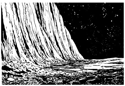 Но перенесенные на поверхность нашего спутника, мы увидели бы в этих местах у своих ног глубокую черную пропасть, простирающуюся далеко за горизонт. Еще пример. На Луне есть так называемая «Прямая стена» – отвесный уступ, прорезывающий одну из ее равнин. Видя эту стену в телескоп (рис. 47), мы забываем, что она имеет 300 м высоты; находясь у основания стены, мы были бы подавлены ее грандиозностью. На рис. 48 художник попытался изобразить эту отвесную стену, видимую снизу: ее конец теряется где-то за горизонтом: ведь она тянется на 100 км! Точно так же и тонкие трещины, различаемые в сильный телескоп на лунной поверхности, должны в натуре представлять огромные провалы (рис. 49).