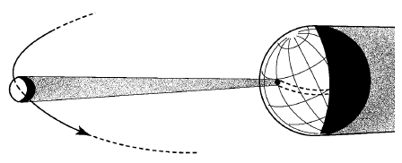 Рис. 54. Конец конуса лунной тени скользит по земной поверхности; в покрытых им местах наблюдается солнечное затмение
