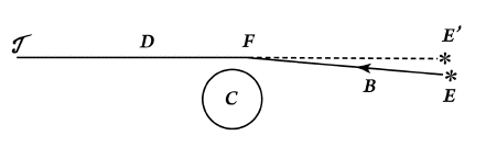 Рис. 56. Одно из следствий общей теории относительности – отклонение световых лучей под влиянием силы тяготения Солнца. Согласно теории относительности земной наблюдатель в Г видит звезду в точке Е по направлению прямой TDFE, между тем как в действительности звезда находится в точке Е и посылает свои лучи по искривленному пути EBFDT. При отсутствии Солнца световой луч от звезды is к Земле Т направлялся бы по прямой линии