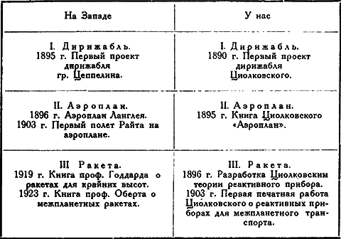Основное ядро ученых его трудов и изобретений относится к области транспорта: прежде всего, транспорта воздушного, а затем – в чем всего блистательнее сказалась мощь его мысли и своеобразие дарования – транспорта заатмосферного, т. е. управляемого полета в пространстве вселенной. Здесь Циолковский является безусловно пионером, на много лет опередившим выдающиеся умы Запада. Красноречиво говорит об этом следующая краткая хронологическая справка, сопоставляющая моменты зарождения одних и тех же технических идей на Западе и у нас (пояснения к схеме даются в последующем тексте):