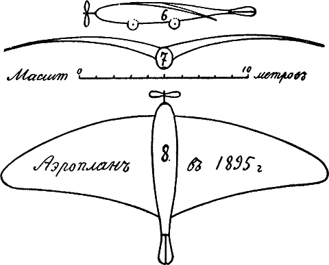 «В 1895 году, задолго до робких попыток Ланглея, Адера, Сантос-Дюмона и полного торжества Райтов, я не только математически разработал теорию аэроплана, но и дал тип его, к которому очень медленно приближаются лишь теперь. Даны чертежи и расчеты, вполне оправдавшиеся только сейчас. Дана картина разбега аэроплана и его поднятия».