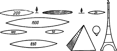 Далее, для какого тела воздушное сопротивление больше: для шара или для тела в форме сигары с таким же поперечным сечением (причем «сигара» движется продольно)? Оказывается, что тело, вытянутое в форме сигары, встречает при продольном движении в 5 раз меньшее воздушное сопротивление, нежели шар такого же сечения (и, следовательно, в 30 раз меньшее, нежели наша круглая пластинка). Вы видите уже отсюда, как важно знать законы аэродинамики для выбора наивыгоднейшей формы воздушного корабля.