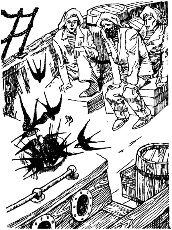 Постепенно солнце раздвинуло щупальцами тучи, и море тотчас охотно забирюзилось, заблестело монетами. Не так убого выглядел и баркас, хотя он был изрядно потрепан. Вдруг в небе послышался шум крыльев, и тотчас около сотни ласточек стали пикировать на баркас. Услышав тревожное щебетанье пернатых, Иван Фотиевич вышел из каморки и сиплым голосом крикнул: