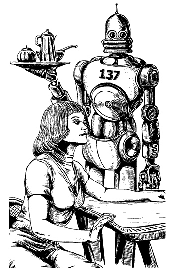 Веселый разговор был прерван появлением телевокса 137. С вытянутыми вперед металлическими руками, в которых висел поднос, он подошел к столику Павла и Киры и, качаясь, остановился.