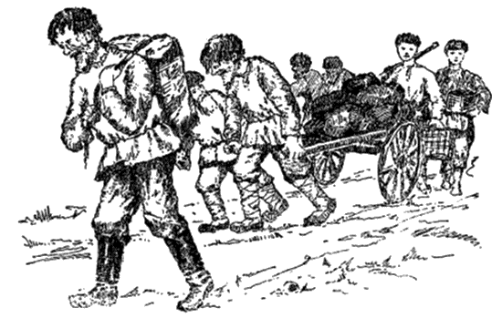 В этот знойный час по дороге, залитой солнцем, медленно двигалась группа крестьян, волоча за собой тележку, нагруженную домашним скарбом. Впереди выступал Федоров. Он нес на плечах огромную корзину с кроликами, цепко охватив ее большими, потными руками. За ним шагали ребята с клетками в руках. В клетках беспокойно возились молодые кролики. По бокам телеги выступали шесть батраков с корзинами кроликов на плечах. Никешка Кривой, Кузя и Юся Каменный волокли тележку с мешками зерна, картофеля и круп. От жары у всех взмокли рубахи.