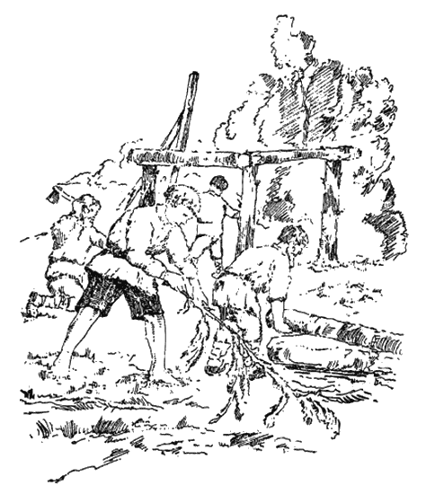 Работа спорилась. Юся Каменный, багровый и мокрый, взмахивал топором и одним ударом отсекал молодые ели от корней. Ребята чистили деревья от веток. Федоров и Никешка рубили жерди пополам, затесывали концы и с силой вгоняли шесты в землю. Остальные заполняли пространство между шестами плетнем.