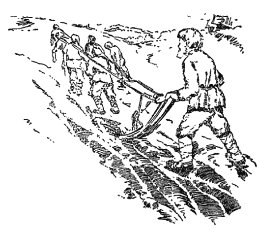 С шутками и смехом притащили плуг. Шестеро впряглись, седьмой, Сережка-гармонист, пошел за плугом. Веревки врезались в плечи. Лемехи, скользнув по дерновине, вошли в землю, отвернув жирные пласты. Пройдя десяток метров, «лошади» заворчали.