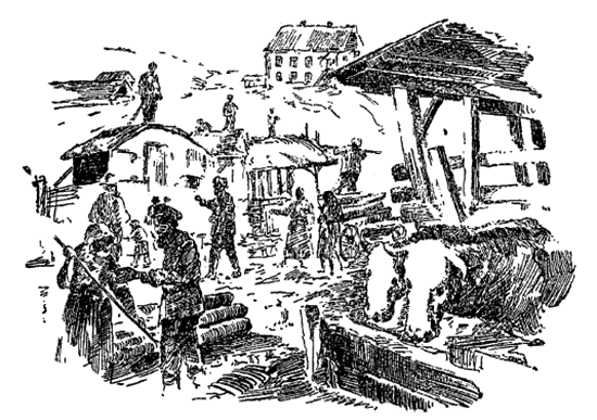 В эти дни на берегу озера с утра сновали взад и вперед люди, со скрипом подъезжали груженные лесом подводы. Крик, шум, гусиное гоготанье, отчаянный визг свиней, удары топоров, грохот бревен, ржание коней и мычанье коров сливалось в нестройный многоголосный гул и гудом каталось над берегом.