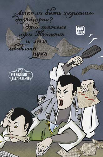 Вот мы и стали самыми профессиональными дизайнерами, какие только бывают. Нам все равно, что оформлять, – мы одинаково хорошо нарисуем как ангелочков с крылышками, так и скучную деловую страницу. Нет стиля или расцветки, в которых мы не выполнили как минимум десятка работ. Все уже было: черный минимализм и розовые тучки с пышным золотом, свиньи в бриллиантах и современное искусство, непонятное нам самим. Мы разбираемся в стилистических особенностях и умеем выдерживать свои работы в заданных рамках, ловко распознаем клиентов, называющих словом «рококо» типичное барокко и просящих сделать «вот этот русский авангард», показывая на японский плакат 1950-х годов. Нам нетрудно сделать так, чтобы было похоже на тот самый японский плакат, и «знаток», оценивающий работу за нашей спиной, непременно заметит: «Вы решили делать русский авангард?»