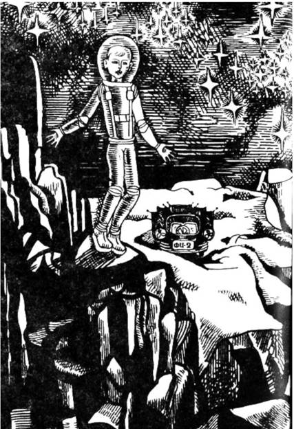 Через сотню метров от того места, где находились наши путешественники, начинались горы. Начинались они с больших и маленьких камней, которые переходили в огромные скалы, горные хребты и вершины, достигая шести и более километров, то есть, такой же высоты, как и на Земле. Если принять во внимание, что Луна меньше Земли в пятьдесят раз, то горы эти можно считать чрезвычайно высокими. Для жителей Земли вид их от вершины до подножия был самый необычный. Мы привыкли, что камни и скалы внизу покрыты землей, растительностью, что они закруглены, а здесь лежали груды камней, словно только что выломанные в горах и выгруженные на каменную площадку. Выше, там, где на Земле мы видим горные леса и луга, здесь были те же самые серые горные скалы. Еще выше, где мы привыкли видеть снег и лед, здесь были те же самые серые острые пики. И так до самых верхних пиков, что потрясающе выделялись на черном небе. В безвоздушном пространстве все контуры и детали были видны очень четко и казались совсем близкими. Но страшно было и подумать подниматься на эти горы, где острые камни лежали в «свежих» кучах, где, кажется, нет поверхности, где могли бы пройти человеческие ноги.