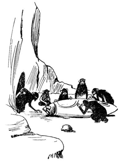 С правой стороны по берегу озера шло, размахивая головой, животное, похожее на белого медведя, только серое. Кроме того, голова этого животного больше была похоже на голову обезьяны, чем медведя. Другие особенности издали нельзя было рассмотреть.