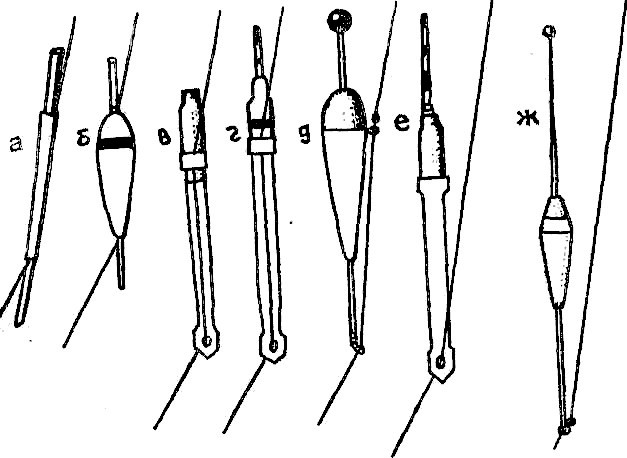 13. Виды поплавков в зависимости от их положения относительно лески: а, б, в, г – неподвижные поплавки; д, е, ж – скользящие (д, ж – с упором)