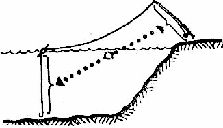 Основной принцип – скользящий поплавок используем в тех случаях, когда глубина воды превышает длину удилища (рис. 15). Например, если длина удилища 3 м, а глубина воды – 4, используйте скользящий поплавок. Он является непременной деталью удочки для ужения на водохранилищах. Недостатком снасти со скользящим поплавком является то, что приманка очень медленно опускается ко дну. По этой причине он не подходит для ужения на быстром течении. В таких случаях лучше пользоваться длинными удилищами, позволяющими применять неподвижный поплавок.