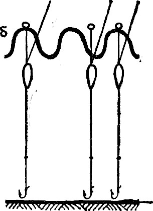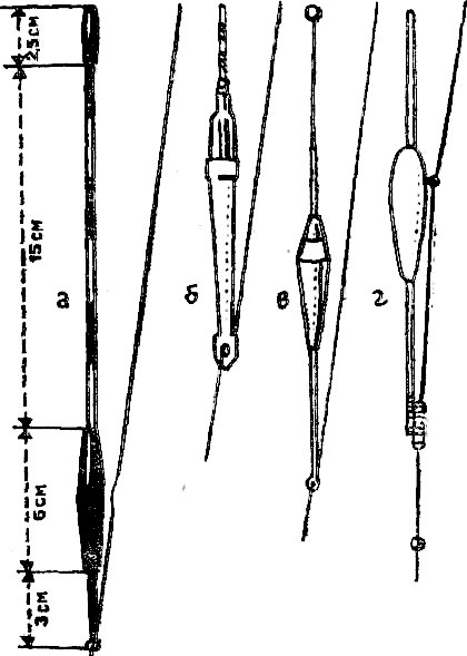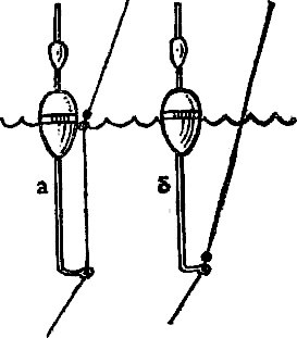 Это не поплавки в смысле слова, потому что они или только сигнализируют о поклевке, или только удерживают леску в натянутом положении. От обычных поплавков они отличаются тем, что не лежат на воде, а подвешены на леске под вершинкой удилища или под концевым кольцом вершинки (рис. 51 б). Это, своего рода, рычаги, следовательно, устройство очень чувствительное к малейшему сокращению лески, которое бывает при поклевке самых осторожных рыб. Действие одного типа такого поплавка показано на рис. 22 и 23.