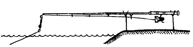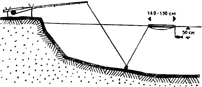 Оно пригодно для водоемов со стоячей водой или медленным течением; для рек с быстрым течением – не пригодно. Удочку собирают так: сперва на леску надевают переворачивающееся грузило, затем, на расстоянии 50 см от конца, закрепляют упор и в последнюю очередь привязывают крючок. В случае применения поводка он должен быть коротким, около 45 см.