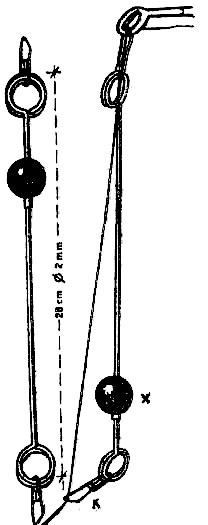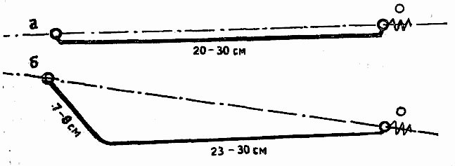 У поплавка с двумя кольцами леска образует ломаную линию, которая мешает при подсечке, так как требуется определенное время для ее выпрямления. У поплавка с одним кольцом такого излома нет и при подсечке леска натягивается сразу. Это относится и к неподвижным поплавкам (см. рис. 18).