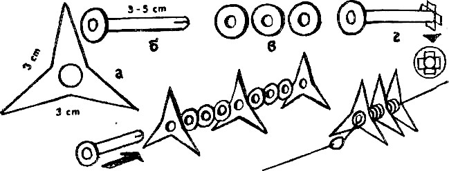 Этот вид грузила очень подходит для глубоких водоемов с галечно-каменистым дном и умеренным течением. Делают его так: берут полую медную или алюминиевую заклепку длиной 3–5 см; затем из листового свинца вырезают подкладки с отверстием в центре, соответствующим толщине заклепки; потом изготовляют звездочки из мягкой пластмассы, на которой обычно бывают, например, ведра или умывальники. Сборка грузила и его размеры показаны на рис. 25. За последней звездочкой идет свинцовая подкладка, которую закрепляют, отогнув концы надрезанной крестом заклепки. Трехконечные звездочки препятствуют перекатыванию грузила-ежика по дну; этому способствует не только их форма, но и эластичность использованного материала.