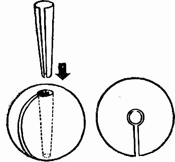 Очень удобно тем, что его можно быстро устанавливать и снимать с удочки. Состоит оно из двух частей: собственно грузила и пластмассового полого ядра (трубки), которое вставляется в сквозное отверстие в центре. Вдоль грузила проходит тонкий разрез; точно такой же имеет полое конусообразное ядро, На леску грузило устанавливают следующим образом: через продольный разрез леску вводят в грузило и полое ядро, которое вставляют в отверстие грузила и поворачивают на 18º. Снимают все в обратном порядке. Подробности видны на рис. 27.