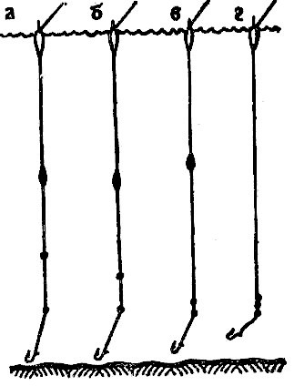 Делается это очень просто (рис 13 д, ж). На леске в определенном месте, в соответствии с ранее установленной глубиной, закрепляем маленький упор; он должен легко проходить через кольца удилища, но задерживать поплавок. Перед забросом поплавок находится у упора, после заброса – соскальзывает к приманке, погружаясь с ней в воду, но затем поднимается по леске к поверхности до упора и начинает функционировать как неподвижный поплавок. Если он не всплывает, то надо подергать леску или повторить заброс.