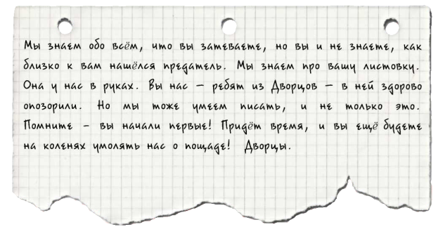 Текст также взывал к чести и дисциплинированности ребят с Другой стороны: «Только предатель выбросит листовку, а тем более – отнесёт её в Дворцы» – стояло там чёрным по белому.