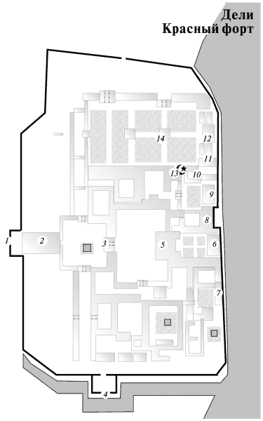 Следующий за Кхас Махалом павильон – Зал частных аудиенций Диван-и-Кхас (Diwan-i-Khas). Легендарный Павлиний трон (1634) стоял здесь до того, как его в 1739 г. увез в Персию Надир-шах.