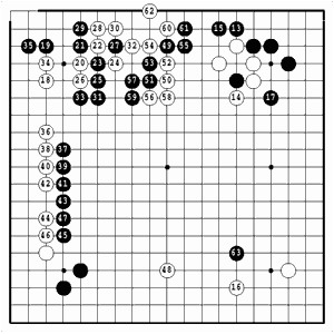 Едва Отакэ Седьмой дан сделал свой 59 ход, занявший уйму времени, как очередные три хода последовали один за другим, словно раскаты эха, ибо были вынужденными для обеих сторон. После этих ходов положение на верхней стороне доски стабилизировалось. Для следующего хода черные имели широкий выбор и поэтому сделать его было нелегко, но Седьмой дан перенес игру на нижнюю сторону и 63 ход занял у него не больше минуты. Похоже, что это была давно задуманная комбинация. Кроме того, возможно, это был далекий прицел – провести разведку в зоне влияния белых на нижней стороне, а потом вновь продолжить игру на верхней стороне и провести там атаку, но такую острую, на какие был способен только Седьмой дан. Стук камней о доску был очень энергичным, словно партнёры в нетерпении делали долгожданные ходы.