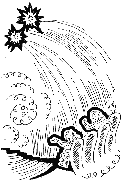 Але раптом «Бета» різко відскочила вбік і зразу ж вистрелила повною чергою. Очевидно, щось було не гаразд. Метеорна ріка розгорілася, як величезний вогняний стовп, і «Бета» різко стрибнула назад – раз, вдруге, втрете. Очевидно, космоліт змушений був робити швидкі, як думка, стрибки. Мабуть, йому загрожував цілий ряд убивчих ударів. Захиститися від них можна було тільки чергами позитронних залпів.