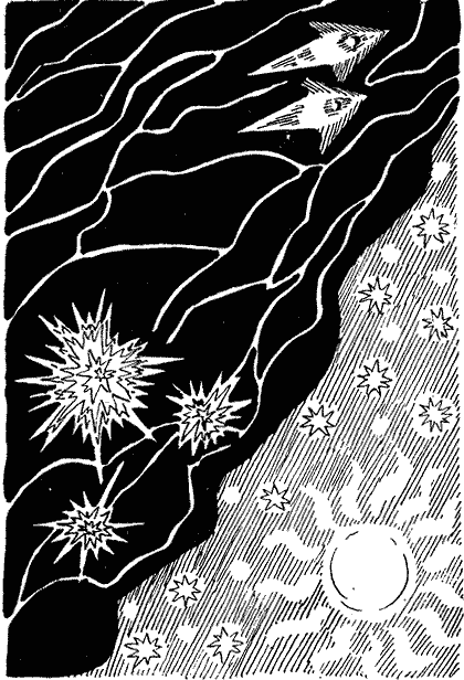 Іон увімкнув тягу «один» і плавною спіраллю обігнав спочатку «Бету», потім «Альфу». І враз перед ними заблищала лавина цих дивних дрібних метеорів, ніби хмара діамантової сарани. Алька негайно відкрила вогонь з усіх метальників.