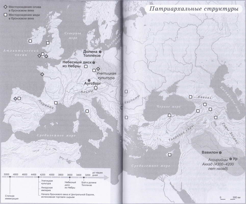 Медный век называют переходным периодом между каменным и бронзовым веками. В эту эпоху люди открыли горное дело и добыли из земли красноватый металл (самородную медь). В Европе это раньше всего произошло на Балканах. Прогресс при этом пришел оттуда же, откуда пришли земледелие и керамика, причем последняя была предпосылкой к обработке меди. Для обработки самородков требовались высокие температуры. Печи для обжига керамики оказались незаменимы. Но добыча и обработка меди оставались промежуточными технологиями. Из этого материала можно было делать украшения и легкое оружие, но после ковки он оставался пластичным. Твердости удалось добиться только благодаря олову, с помощью которого люди наконец переплавили медь в бронзу – эта технология распространилась сначала на Ближнем Востоке, 5000 лет назад. Новый металл расчистил дорогу в будущее, ведь он открывал совершенно новые возможности для производства оружия, инструментов и сельскохозяйственных орудий. Бронза была для человека не просто новым материалом – она означала вхождение в доселе неизвестную сферу производства. Открытие меди и создание бронзы были мощнейшими – если не единственными – предпосылками к появлению первых высоких культур, основы которых были заложены уже в IV тысячелетии до нашей эры на Ближнем Востоке и в Средиземноморском регионе, в то время как в некоторых частях Центральной и Северной Европы по лесам еще бродили охотники и собиратели. На Тигре и Евфрате возникли такие города, как Ур и Вавилон, в Египте расцвело царство фараонов, в Анатолии – хеттская и несколько позже основанные минойская и микенская, первые высокие европейские культуры.