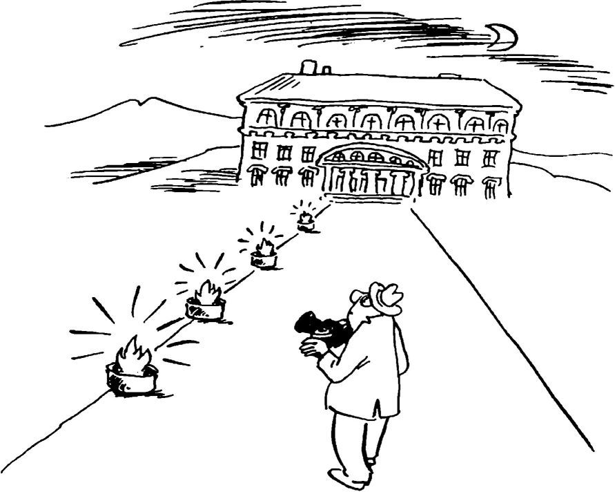 С помощью фотоаппаратуры вы измеряете характеристики света от ближайшего факела, а потом шагами высчитываете расстояние. Десять метров! Затем вы измеряете характеристики света самого дальнего от вас факела, самого тусклого, который стоит у лестницы в усадьбу. Вы обнаруживаете, что его яркость составляет одну десятитысячную яркости ближайшего факела. Так как вы прекрасно знаете, что яркость должна уменьшаться в 4 раза при удвоении расстояния, то после быстрых вычислений узнаете, что расстояние до особняка составляет 1000 метров, проще говоря, километр.