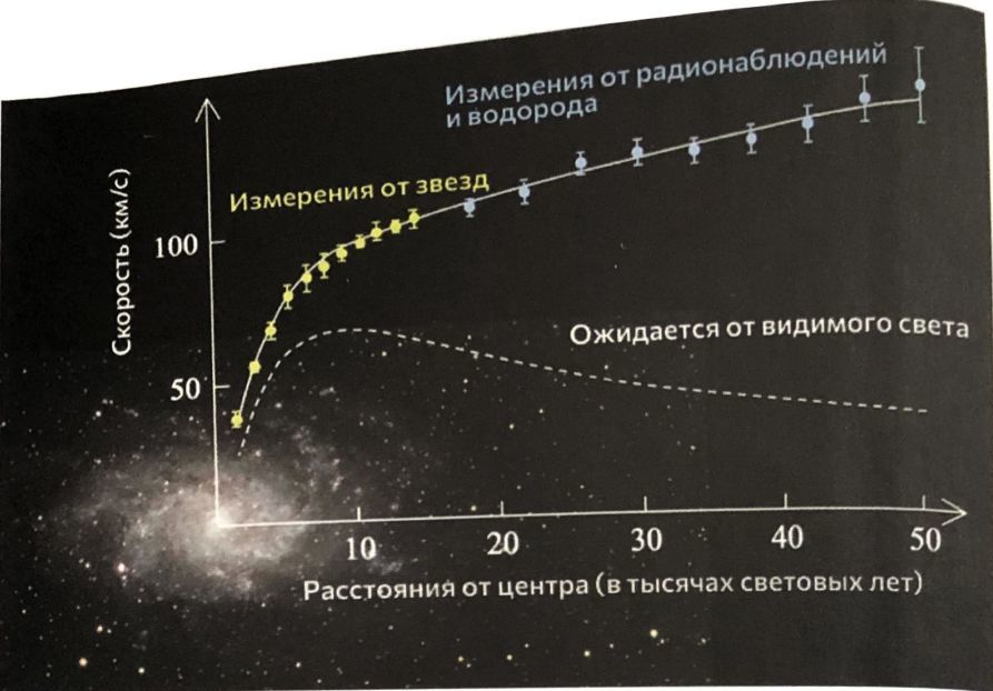 А вот результаты измерений на периферии оказались крайне неожиданными. По правде говоря, звезд там негусто. Настолько негусто, что количество материи внутри особо не увеличивается по мере отдаления от центра. Казалось бы, в таком случае влияющая на притяжение материя должна оставаться на примерно одном уровне по мере отдаления во внешние части галактики. В то же время чем дальше мы удаляемся от звезд в центре галактики, тем слабее их гравитационное воздействие. В результате логично ожидать ослабления гравитации при движении наружу во внешние части галактики. Таким образом, скорость вращения галактик тоже должна становиться все ниже и ниже по мере приближения к краям.