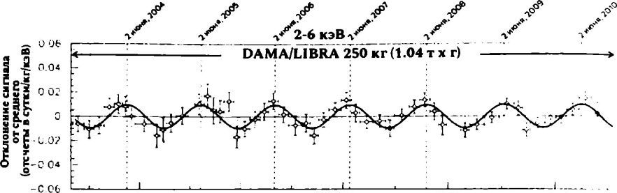Вспышки света в эксперименте. По оси ординат мы видим, как количество световых вспышек колеблется вверх и вниз вокруг среднего значения. По оси абсцисс – количество дней. Крестиками показаны измерения для эксперимента. Изогнутая линия показывает, чего ожидается от сигнала темной материи. На рисунке отражены данные за семь лет сбора, и мы ясно видим семь колебаний. Может, это ветер от вимпов?
