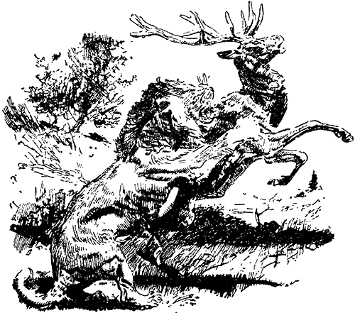 Некоторое время все было тихо. Неожиданно совсем близко раздался треск ломающихся ветвей и из невысокого кустарника выскочил могучий, с великолепными рогами олень. За ним по пятам несся пещерный лев. Несколькими гигантскими прыжками он настиг оленя, прыгнул на него и, сбив с ног, разорвал ему горло. По телу оленя еще пробегали последние судороги, а лев уже вырывал из него куски.