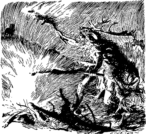 Добежав до горящих сучьев, колдун остановился. Приподняв оленью шкуру, он повесил на шею талисман, схватил брошенные сучья и, покружившись, снова раздул на них пламя.