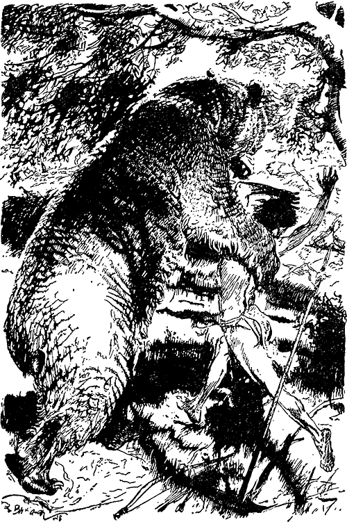 Ом, крадучись, приблизился. Прислонив копье к дереву, он наложил стрелу на тетиву и прицелился. Резкий свист – и стрела вонзилась в темя медведя; наконечник, пробив шкуру, застрял глубоко в черепе.