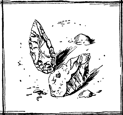 Однако игра с золотым камешком продолжалась недолго. Седому Гуану она надоела первому, и он отправился дальше по берегу. Вскоре он криком подозвал остальных охотников и, улыбаясь, показал им лежащие вокруг конкреции кремня. Выбрав подходящий камень, Гуан сел на землю и другим камнем стал оббивать его. Остальные последовали примеру Гуана, и вот уже слышался только монотонный стук и свист отлетающих осколков.