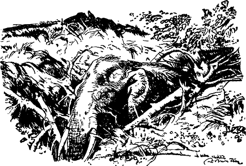 Но отчаянная борьба животного была напрасной. Камни непрерывно сыпались на его голову. Постепенно слон начал уставать, слабеть. Под конец, обессилевший, он уже лежал с закрытыми глазами. Из многочисленных ран струилась кровь. Он уже не чувствовал, как на его череп посыпались страшные удары суковатых палок и мощных дубин. Смерть не заставила себя долго ждать. Еще несколько раз дрожь пробежала по громадному телу, и все было кончено.