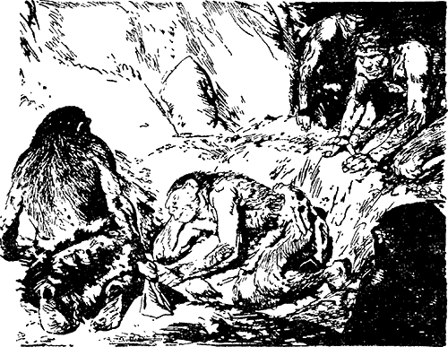 На стоянке под нависшей скалой собралось все племя неандертальцев. У костра лежит истекающий кровью юноша. Лицо его мертвенно бледно, глубоко запавшие глаза закрыты, сжатые губы посинели. Над ним стоит другой молодой охотник и взволнованно объясняет что-то – возгласами, отдельными словами, жестами.