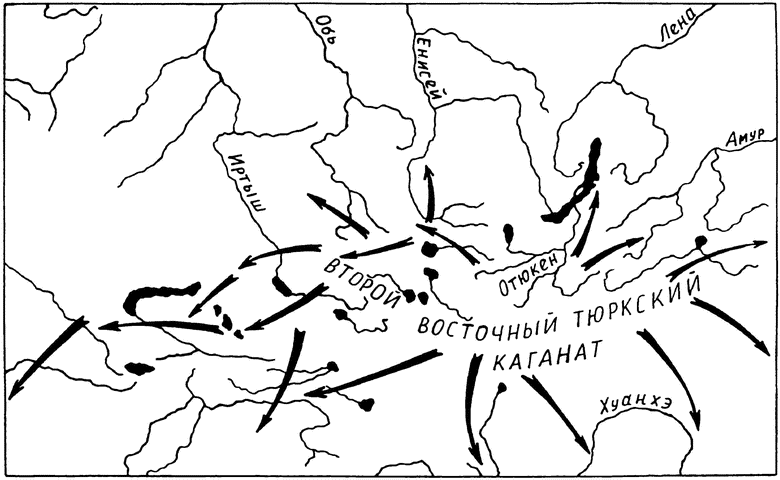 Обоснование ставки в Отюкенской Черни, в Хангае, вне пределов досягаемости китайских войск, позволило кок-тюркам избежать военного разгрома. В то же время они смогли подчинить все кочевые племена, совершать далекие походы в Китай, Восточный Туркестан и Среднюю Азию (рис. 7).