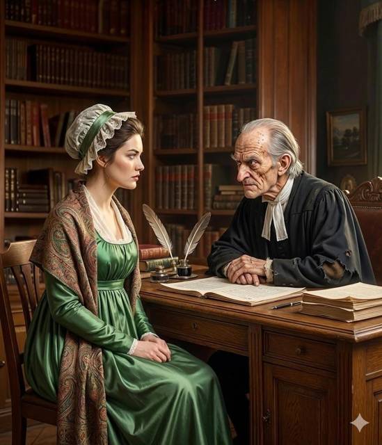 Она кивнула, хотя явно хотела возразить. Я толкнула дверь и вошла. Внутри было темно и тихо после уличного шума. Узкий коридор, скрипучий пол, запах чернил, пыли и сургуча. На стенах портреты каких-то мужчин в париках и мантиях, потемневшие от времени. В конце коридора ещё одна дверь, приоткрытая. Оттуда доносился скрип пера и покашливание.
