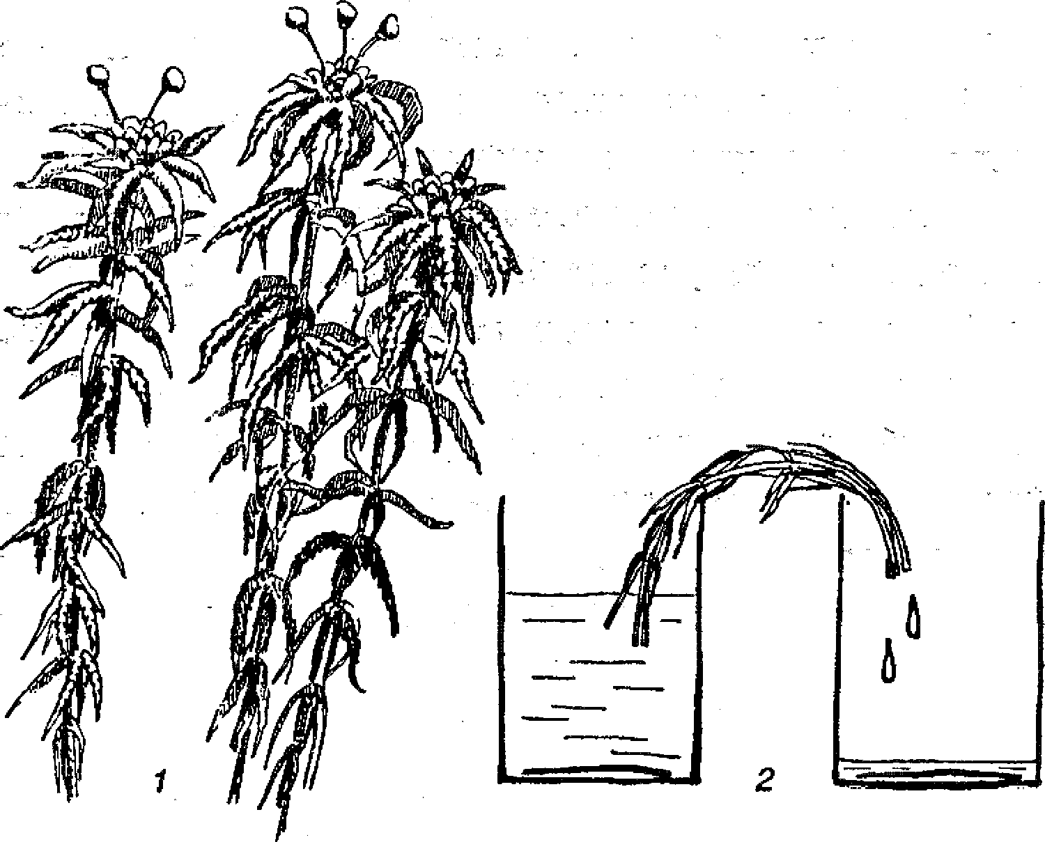 Сфагнум. Прижатые к «стеблю» веточки сфагнума (1) способствуют возникновению капиллярной силы, которая поднимает жидкость вверх (2)