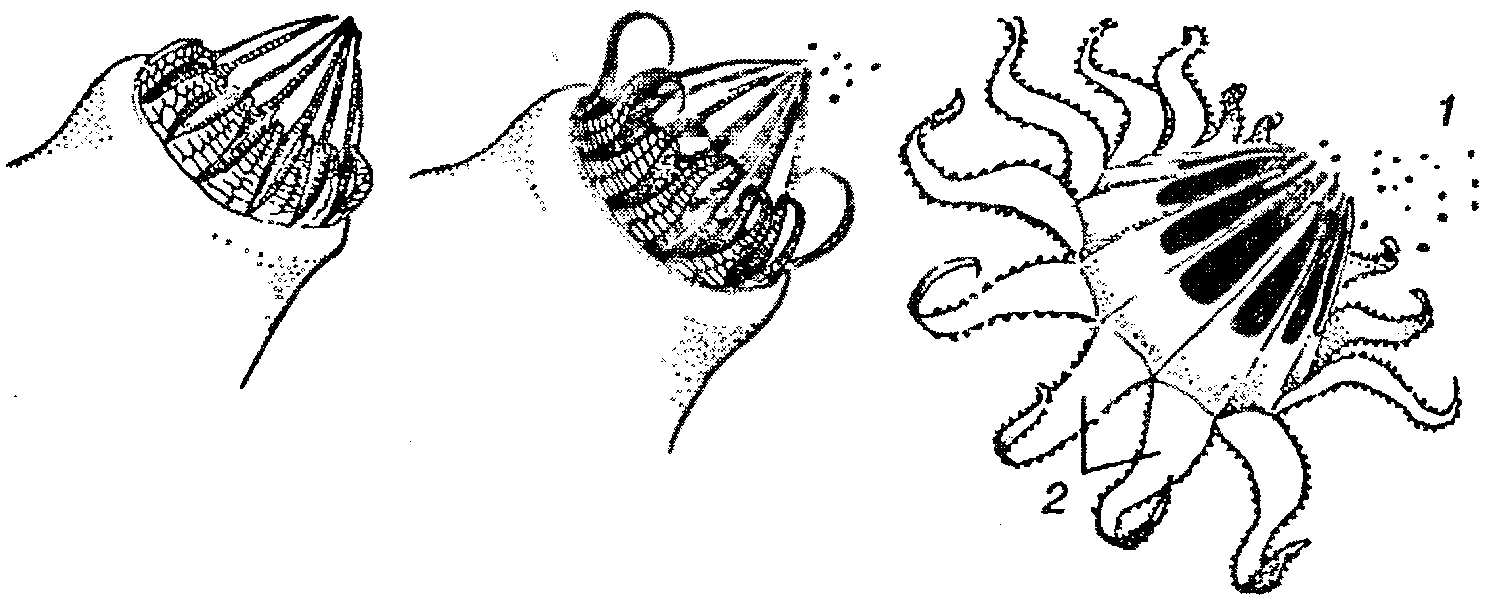 Коробочка политрихума: 1 – споры; 2 – зубцы, регулирующие степень открытия коробочки